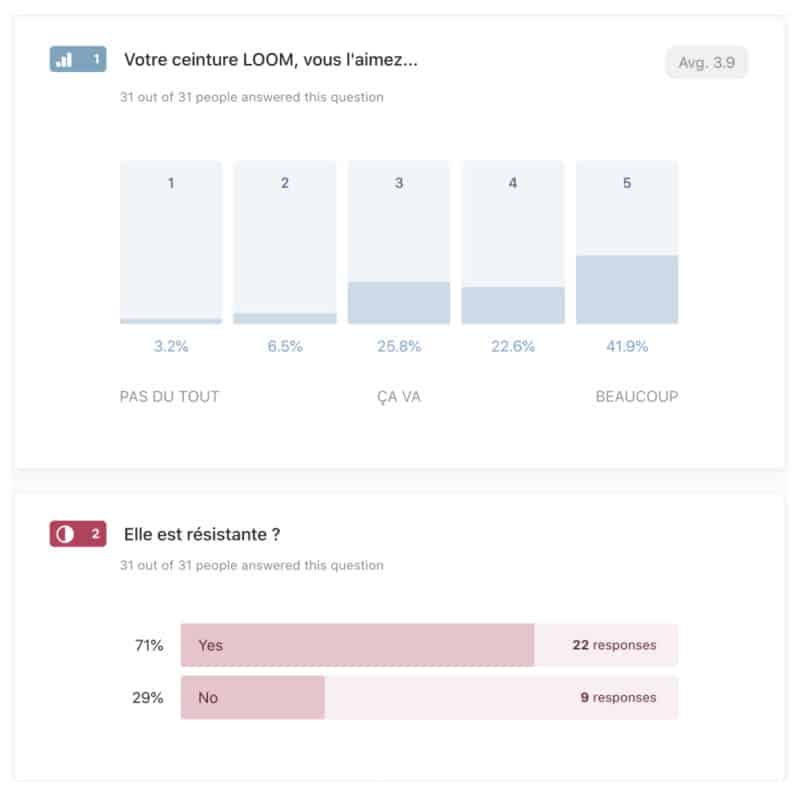 Note de 3,9/5 et 30% des personnes qui pensent que notre ceinture n’est pas résistante : les ingrédients d’une dépression pour l’équipe du métier à tisser. C’est aussi à ce moment-là que nous avons compris 2 choses. 1/ nous ne pouvons pas faire aveuglément confiance à nos fournisseurs. 2/ Les tests (en laboratoire et en conditions réelles) sont vraiment hyper importants. Sur la base de cette mésaventure, un processus de tests et de contrôles de qualité systématiques a été mis en place, qui continue d’être amélioré chaque jour.