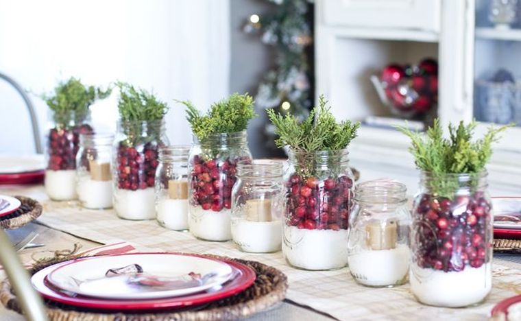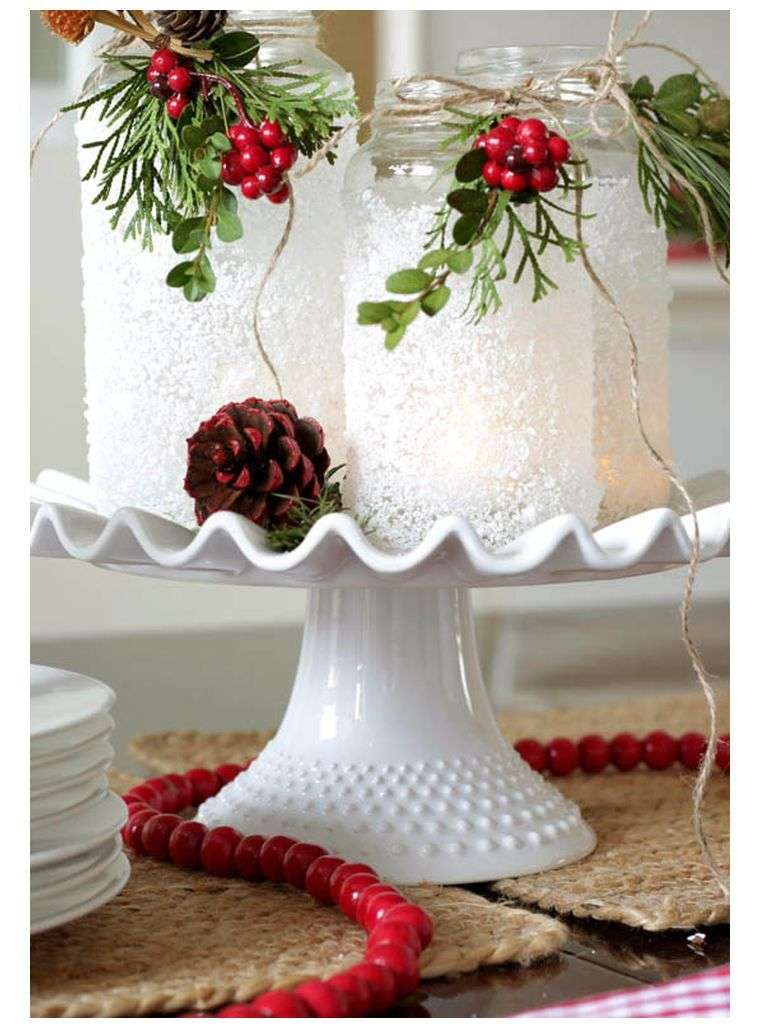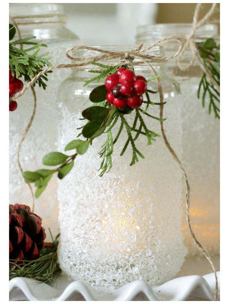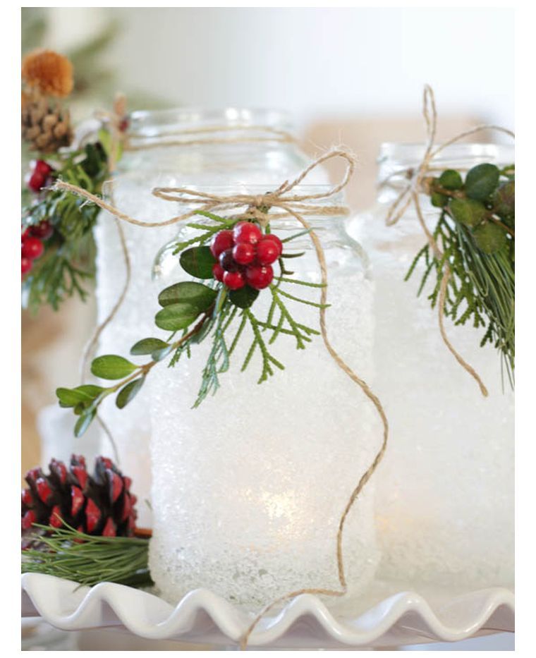 Munissez-vous de bocaux en verre, peignez-les ou laissez-les transparents, puis ajoutez des éléments décoratifs de saison : branches de sapin, perles, rubans rouges et verts. Pour évoquer la neige, versez du sel au fond du bocal (environ un tiers du volume suffit).