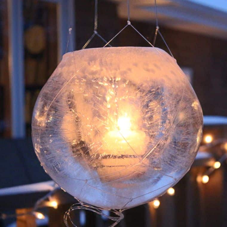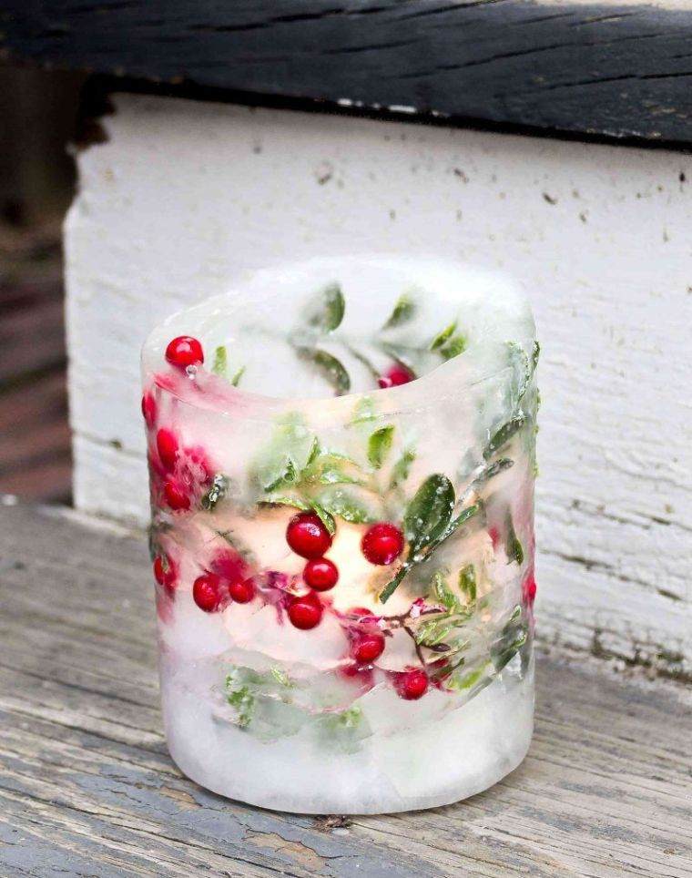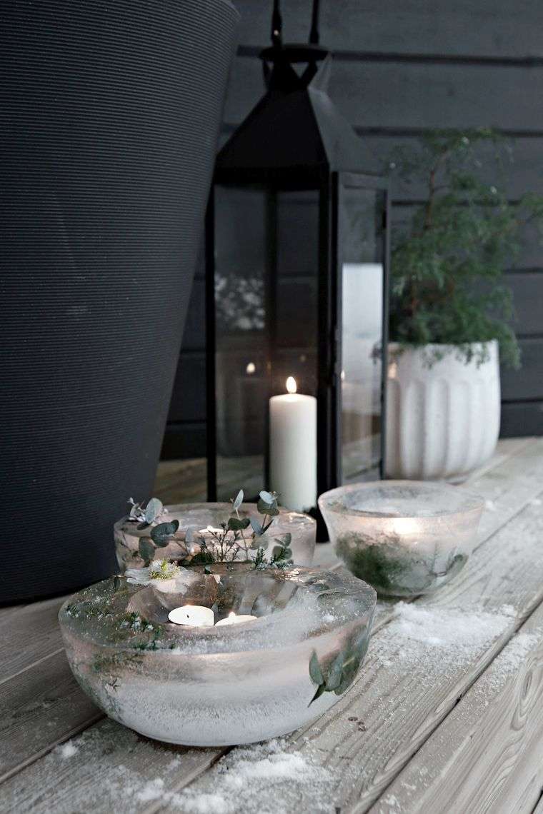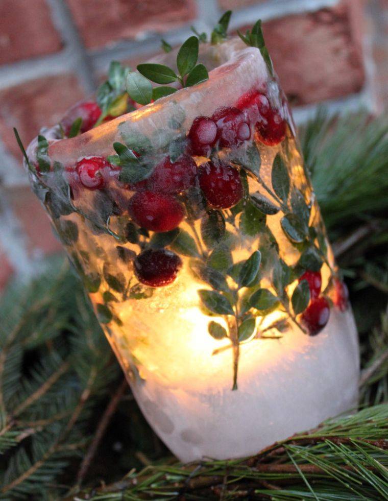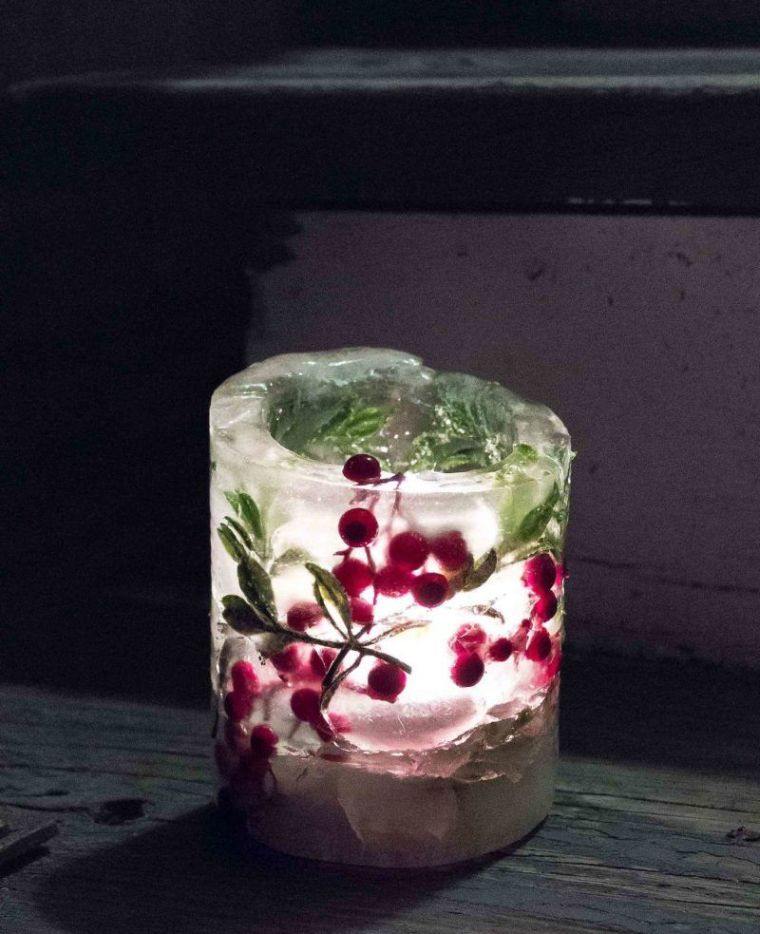 Autre option : remplissez un ballon de baudruche d’eau, laissez-le geler puis retirez l’enveloppe. Placez une bougie à l’intérieur, disposez la sphère sur le perron ou dans le jardin. La lumière diffuse à travers la glace, créant un spectacle unique à chaque création.