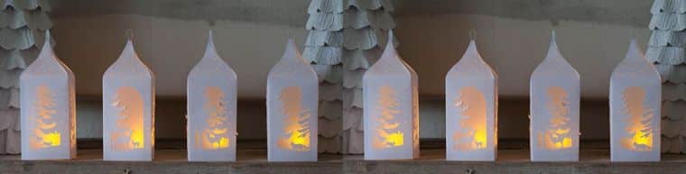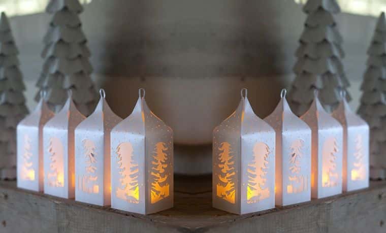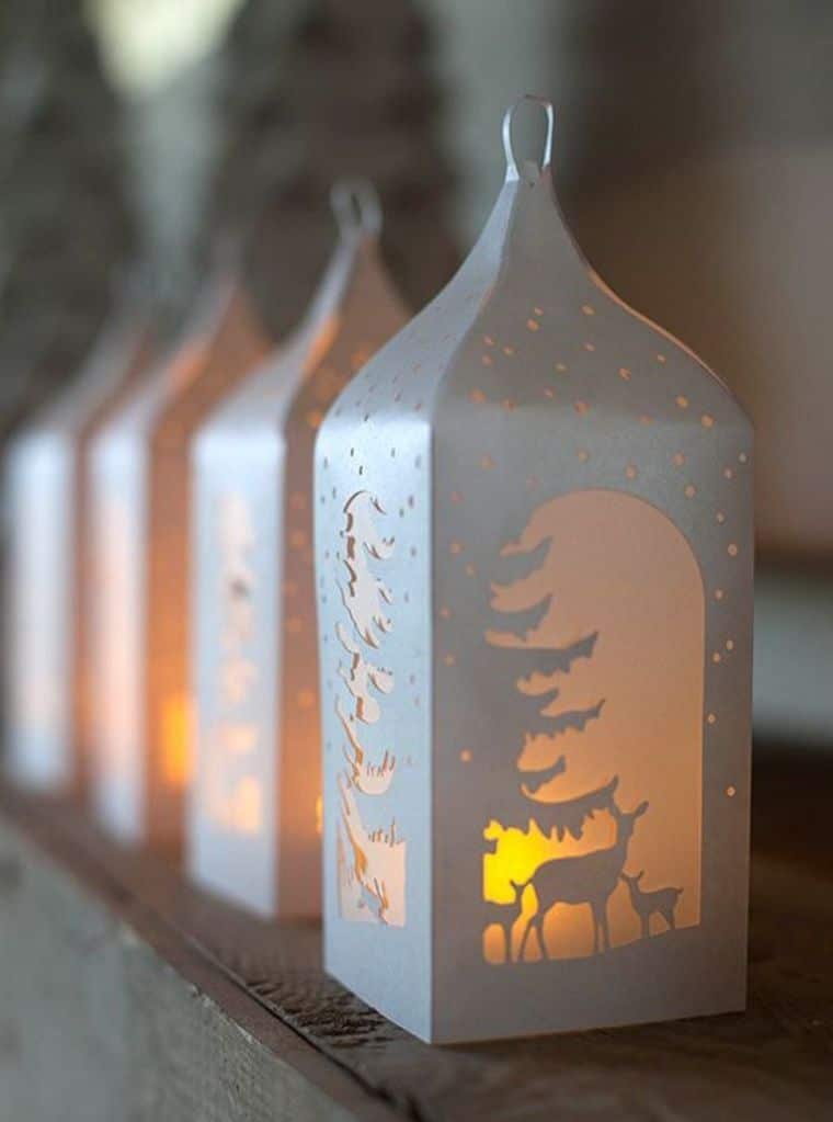 Le papier blanc se prête parfaitement à l’ambiance hivernale. Ce type de lanterne, réservé à l’intérieur, trouve sa place sur la cheminée ou au centre de la table. L’astuce ? Découper des silhouettes de saison : sapins, étoiles, animaux nordiques… ou des formes plus simples comme le bonhomme de neige. Laissez libre cours à votre inspiration.