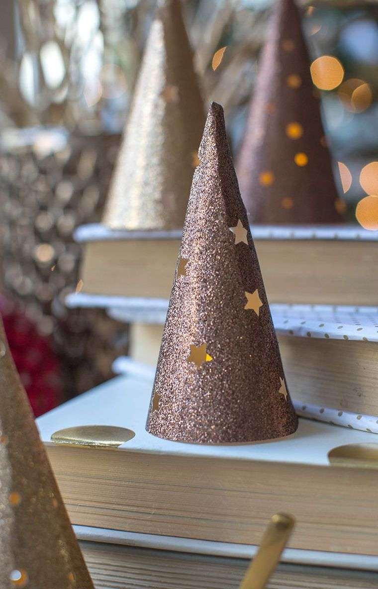 Une idée simple : réalisez des cônes en carton, à poser sur de petites bougies LED. Percez des ouvertures en forme d’étoiles ou de flocons, puis colorez ou vernissez vos créations, voire ajoutez quelques paillettes. Effet garanti sur une console, près de la cheminée ou autour du sapin.