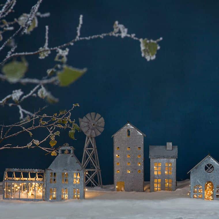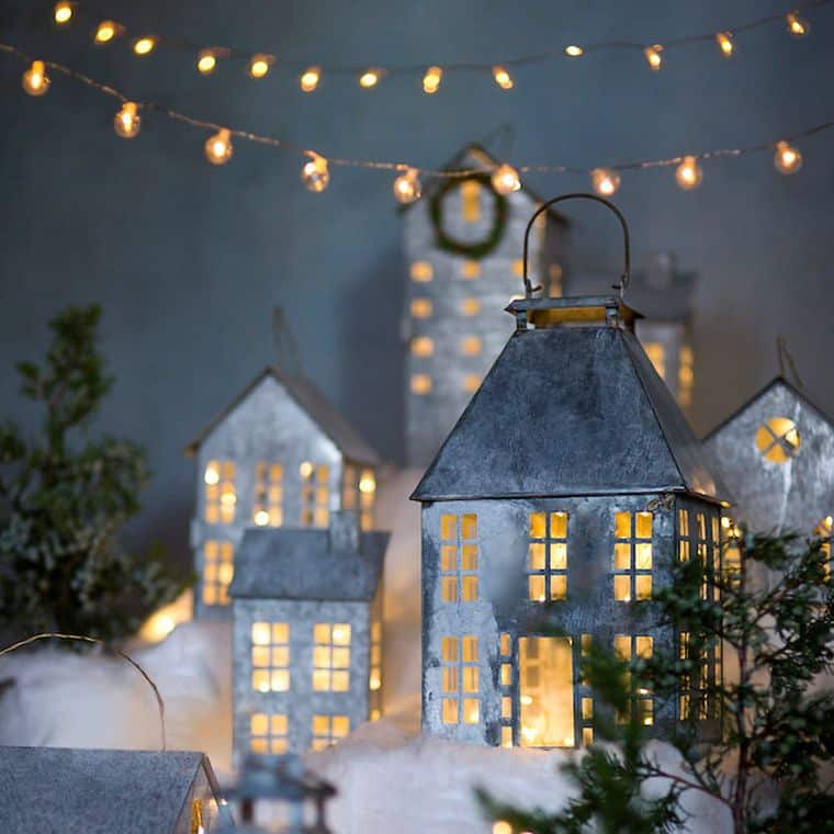Envie de sortir des sentiers battus ? Imaginez un village miniature, tout en lumières. Une nappe blanche ou un tissu évoque la neige. Disposez au centre maisons en métal, figurines en céramique ou modèles en carton confectionnés maison.