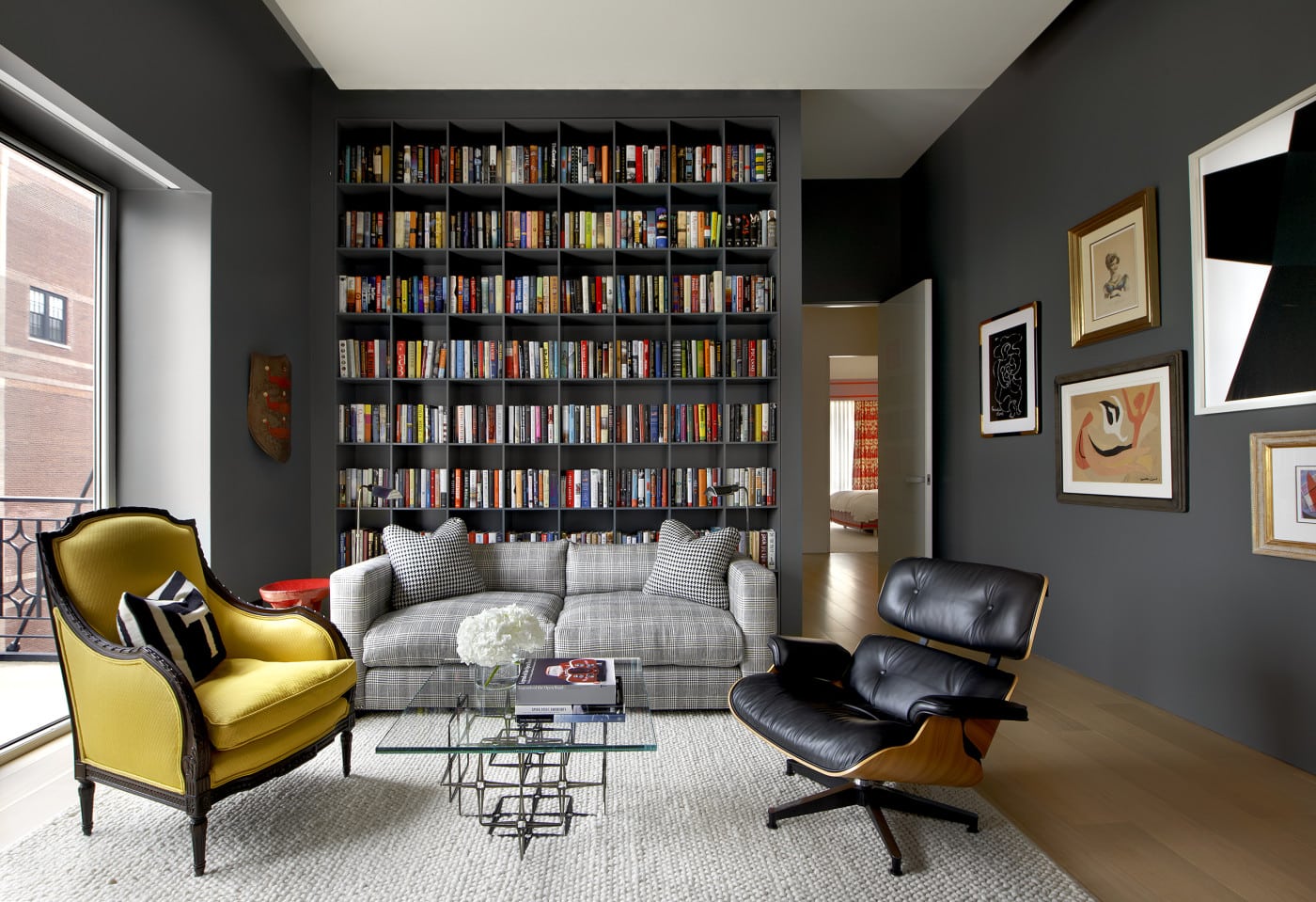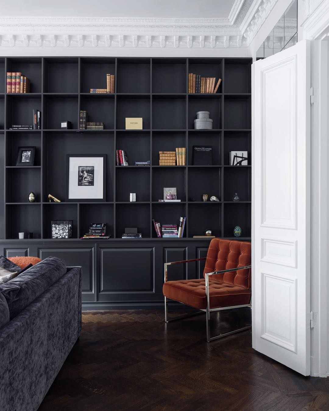 À l’inverse, une bibliothèque noire revendique une présence forte. Elle signe un salon de caractère, où chaque livre a sa place dans un décor magistral.
