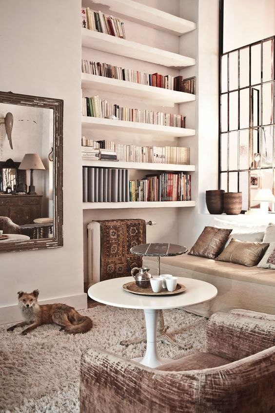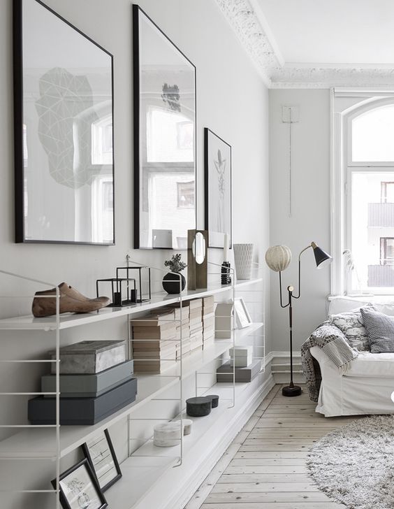 Opter pour une bibliothèque blanche, c’est alléger la pièce et sublimer chaque objet exposé. Impossible de passer à côté de cet effet aéré, qui invite à la contemplation.