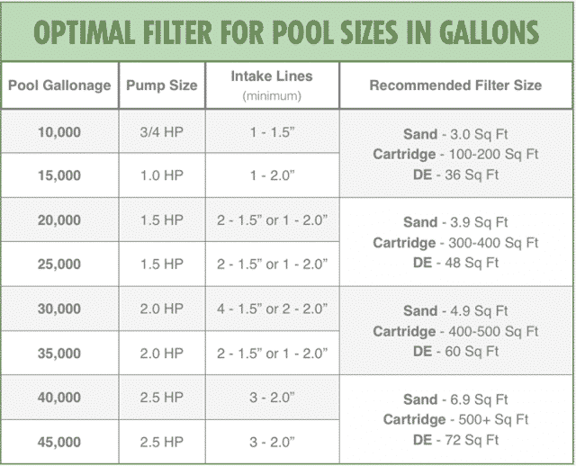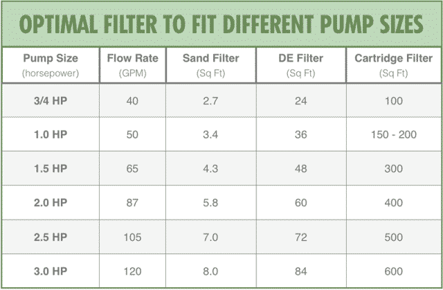 Les filtres sont évalués en gallons par minute (GPM) par pied carré. Choisissez un filtre dont le débit est au moins équivalent à celui de votre pompe. Il vaut mieux voir un peu plus grand : un filtre d’au moins 1 pied carré pour 10 000 gallons d’eau fait souvent l’affaire.